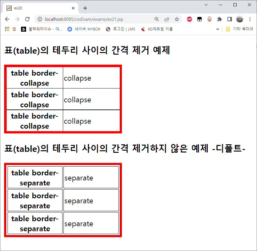 ① table-border:collapse; 에서는 공백이 없어진 것을 확인할 수 있습니다.