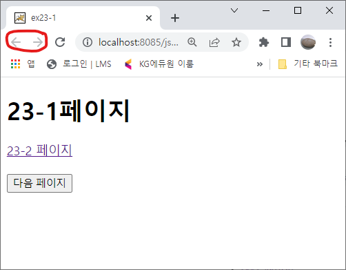 ④ 다음 페이지 버튼을 누르면 웹 브라우저의 앞으로 가기 기능과 같기 때문에 앞으로 가기 버튼이 비활성화 되는 것을 확인할 수 있습니다.