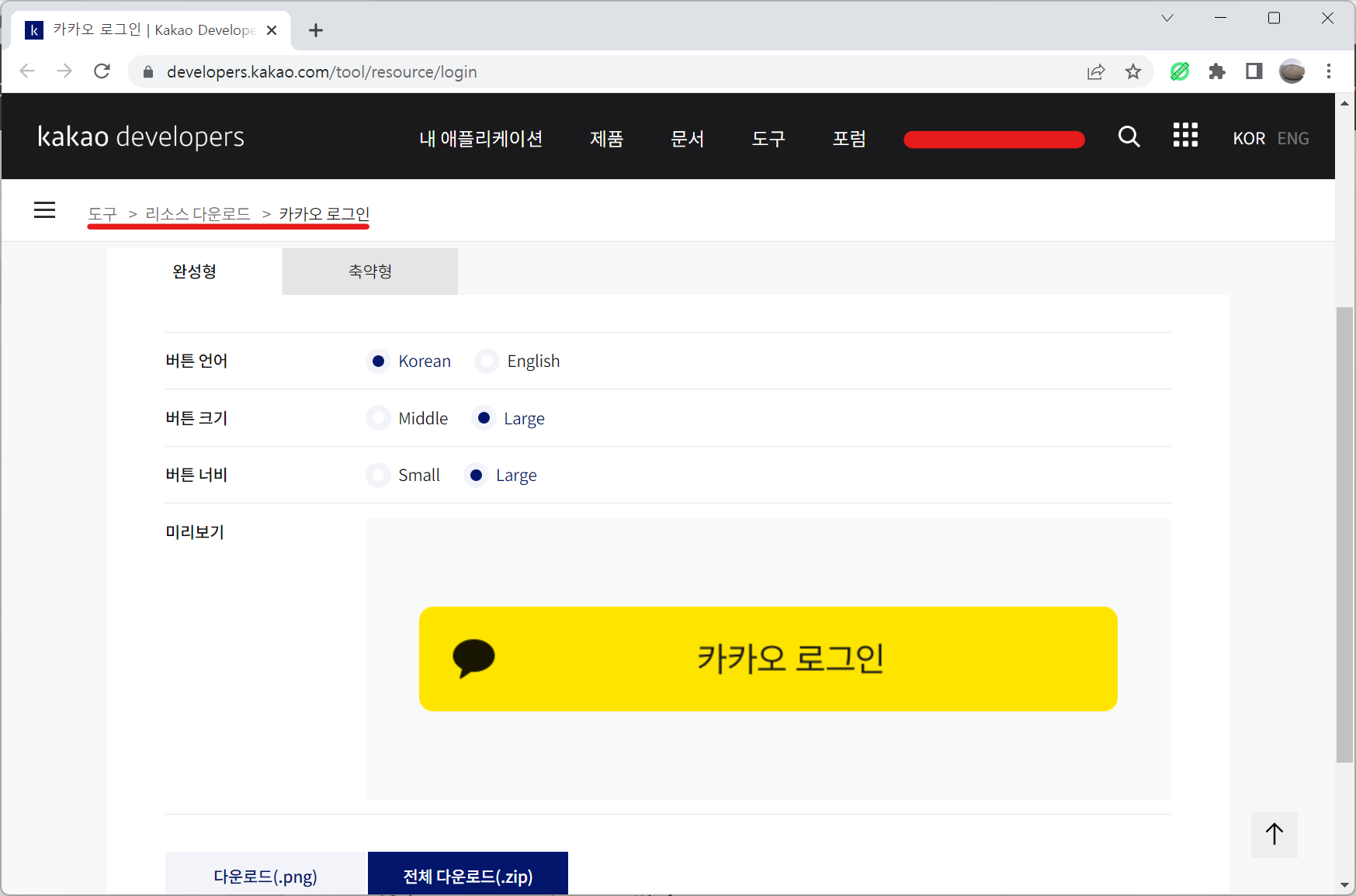 변경된 아이콘을 사용하고자 한다면 '도구'->'리소스 다운로드'->'카카오 로그인' 에서 사용이 가능합니다.