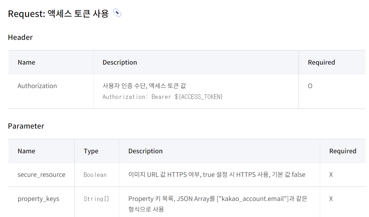엑세스토큰을 사용하여 연결할때에는 request의 header에 Authorization의 정보가 입력되어야 하며 이때 필요한 것이 ACCESS_TOKEN입니다.
