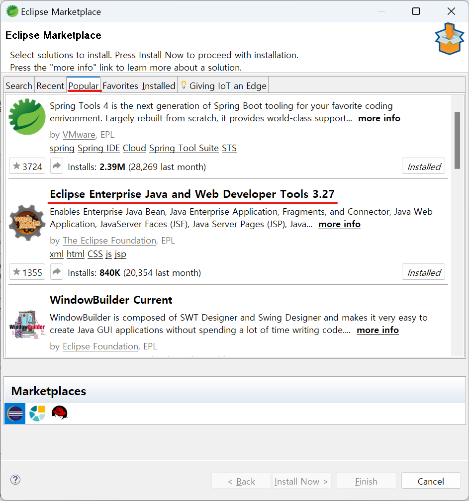 Popular -> Eclipse Enterprise Java and Web Developer Tools 3.27을 install 합니다.