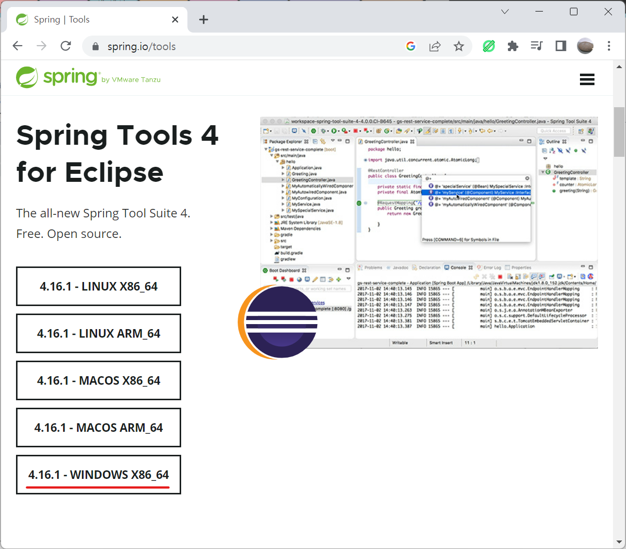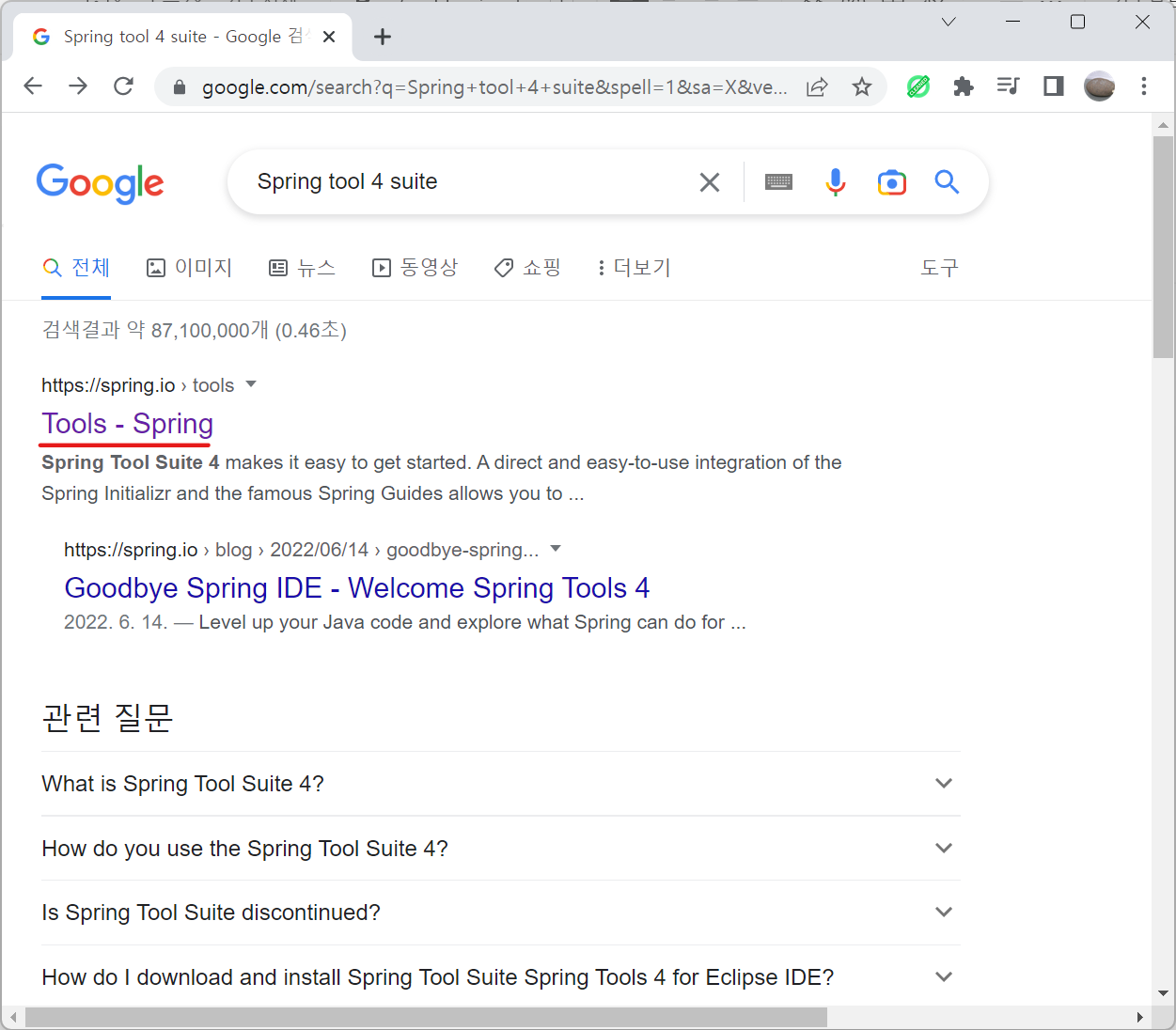 구글에서 Spring tool 4 suite 검색 후 최상단에 위치한 Spring.io 의 링크로 접속
