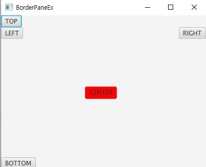 실행 결과가 AnchorPane과 비슷해 보이지만, top 버튼은 top 구역의 좌측 상단, left 버튼은 left 구역의 좌측상단, right 버튼은 right 구역의 우측 상단, bottom 버튼은 bottom 구역의 좌측 하단에 위치되어 있어 그렇게 보이는 것이므로,