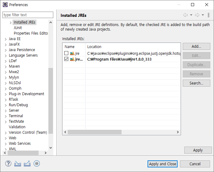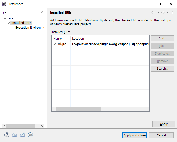 위 사진처럼 installed JREs 에 새로이 경로가 설정된다.