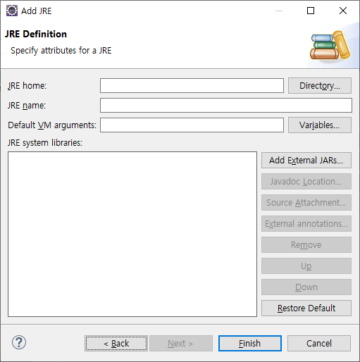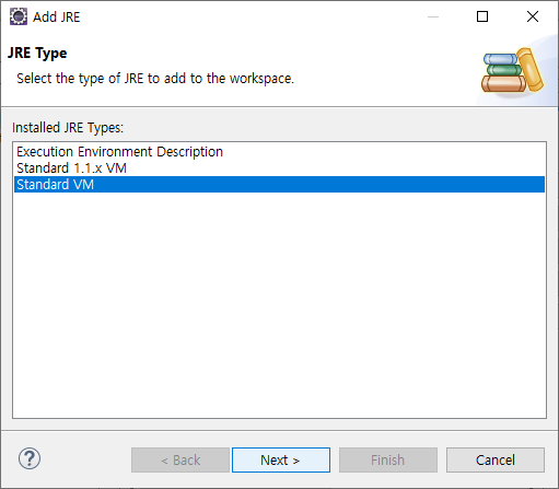 이클립스 실행 - window - properties - installed JREs - Add - Standard VM - Directory - jre 설치 경로