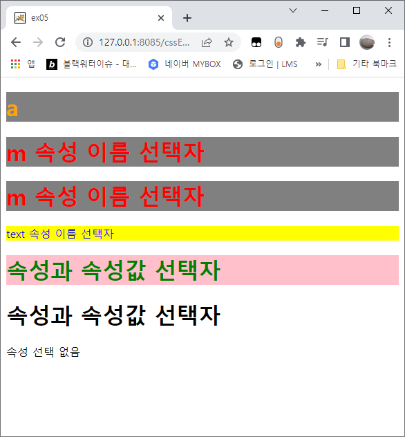 <h1 text="attr2">속성과 속성값 선택자</h1>