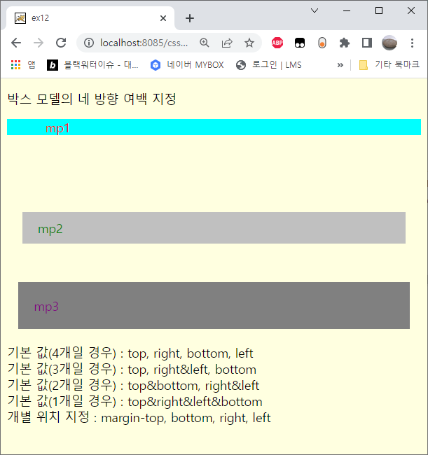 .mp2 { background-color: silver; color: green; margin: 20px; padding: 10px 20px; } /* 값 2개 입력 */